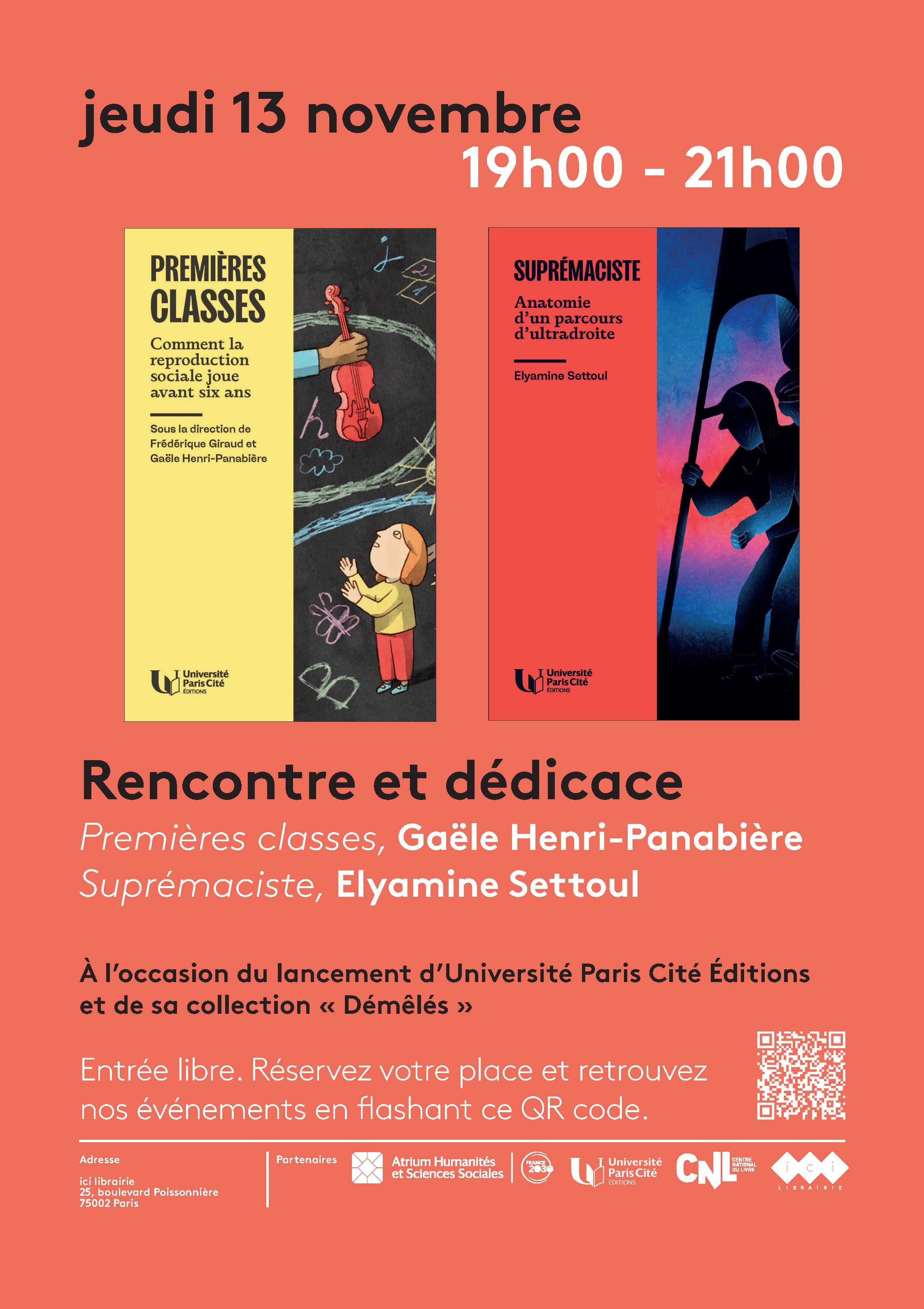 Au programme : échanges avec l’équipe de la maison d’édition, ainsi qu’avec Elyamine Settoul, auteur de Suprémaciste. Anatomie d’un parcours d’ultradroite et Gaële Henri-Panabière, co-directrice de Premières classes. Comment la reproduction sociale joue avant 6 ans. Rencontre suivie d’une séance de dédicaces.