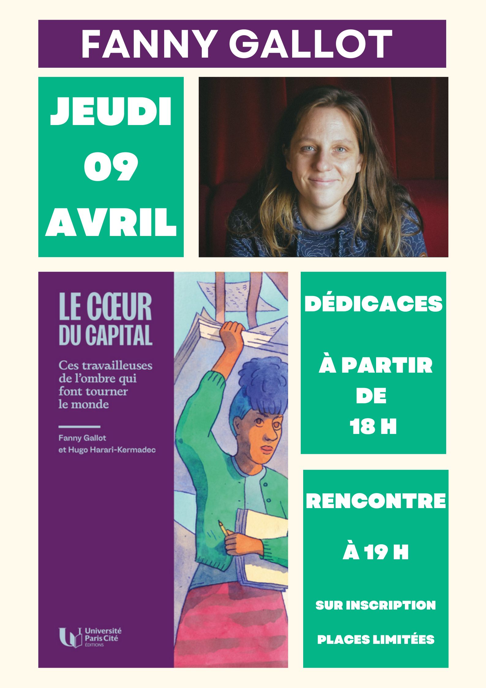Le 9 avril, de 18h à 20h15, à Angers, la librairie-café L’Etincelle organise une rencontre avec Fanny Gallot à l’occasion de la parution de Le Coeur du capital. Ces travailleuses de l’ombre qui font tourner le monde.